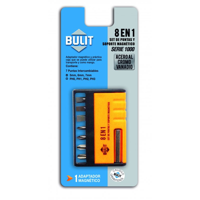 Contiene 7 puntas intercambiables de acero al cromo vanadio.