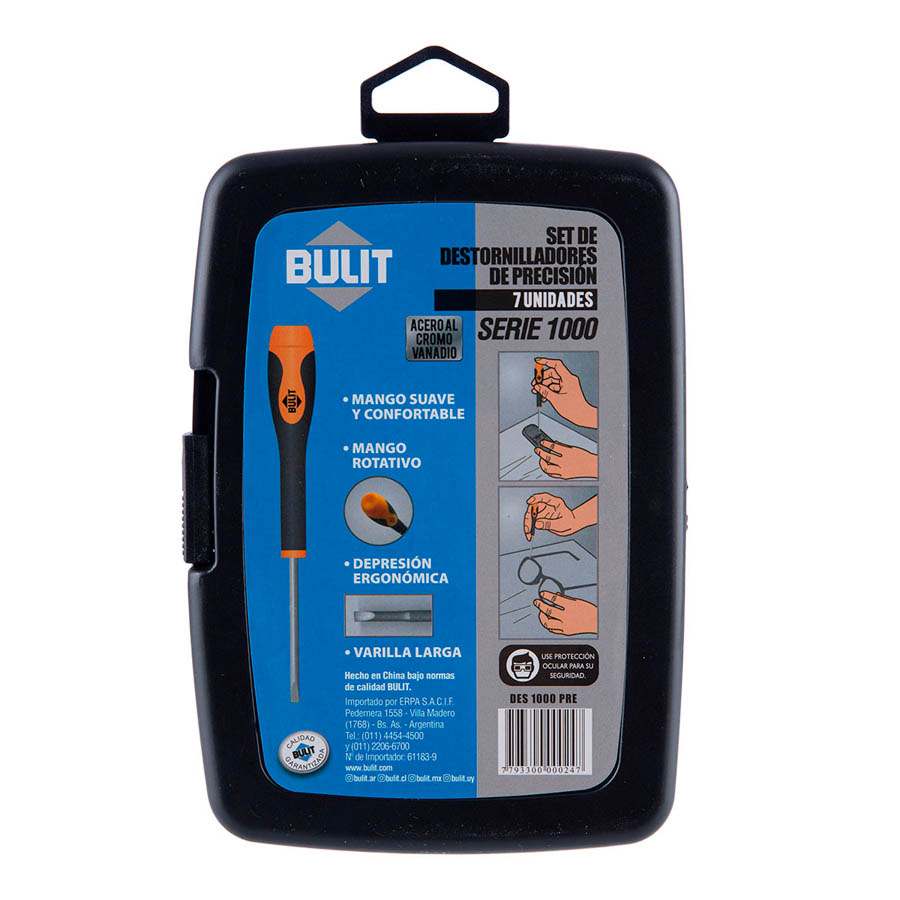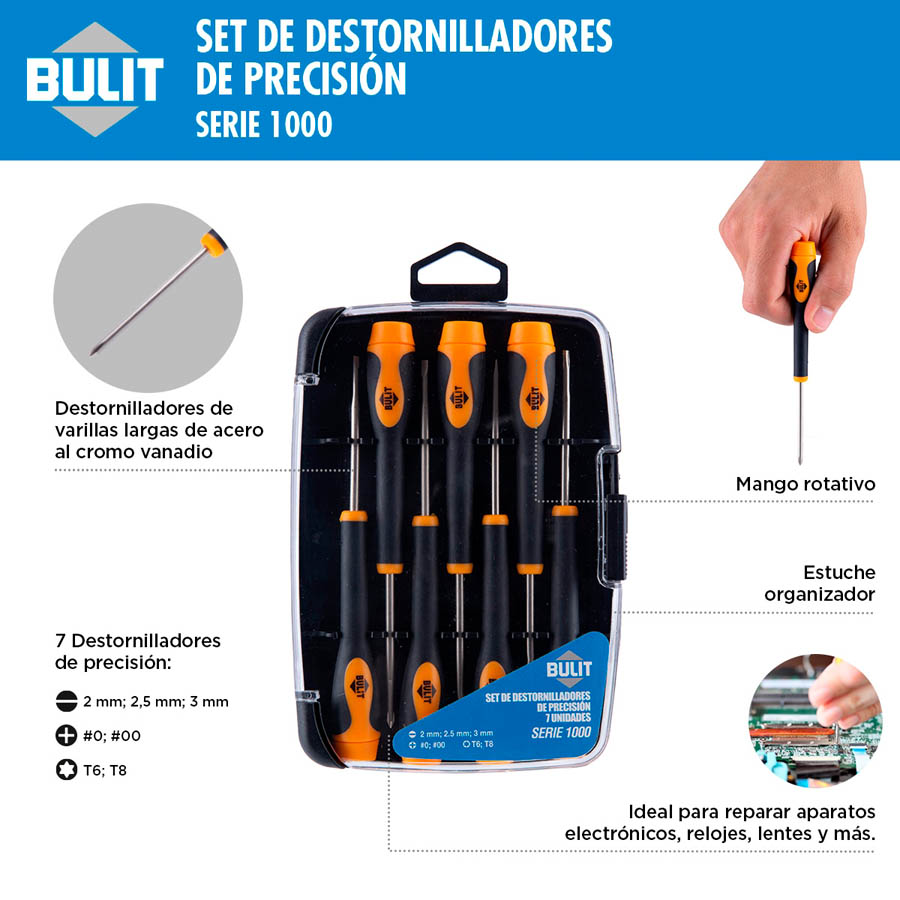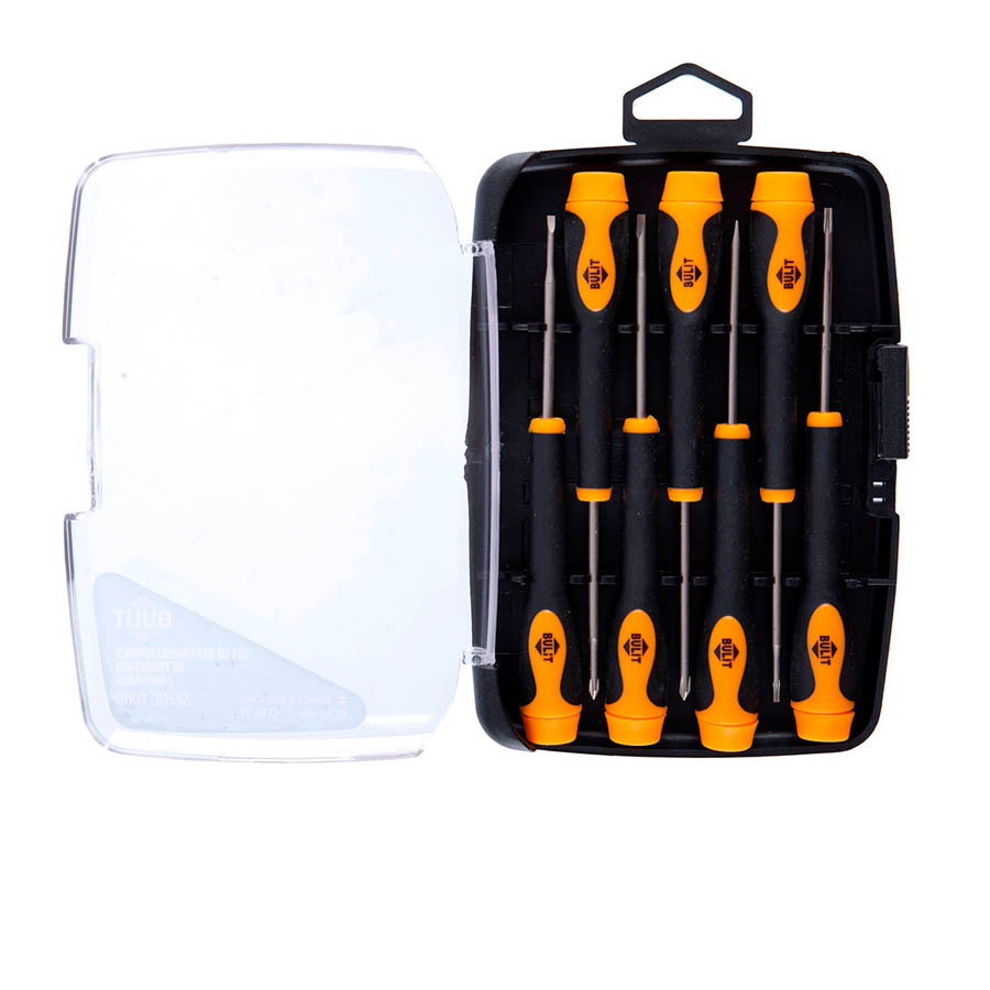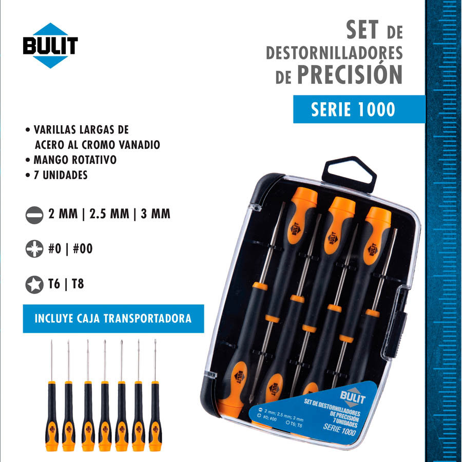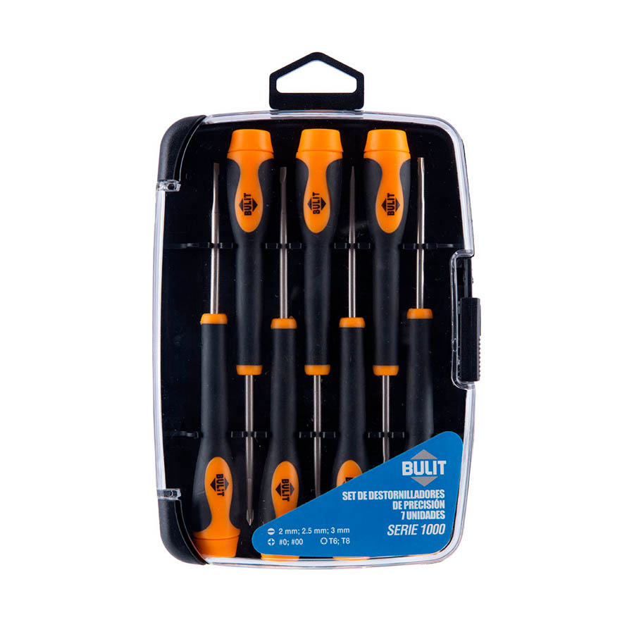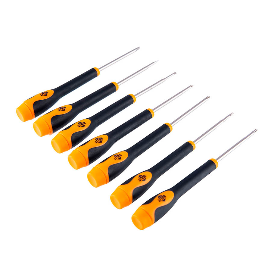 Set compuesto por 7 destornilladores de varilla larga, de acero al cromo vanadio.