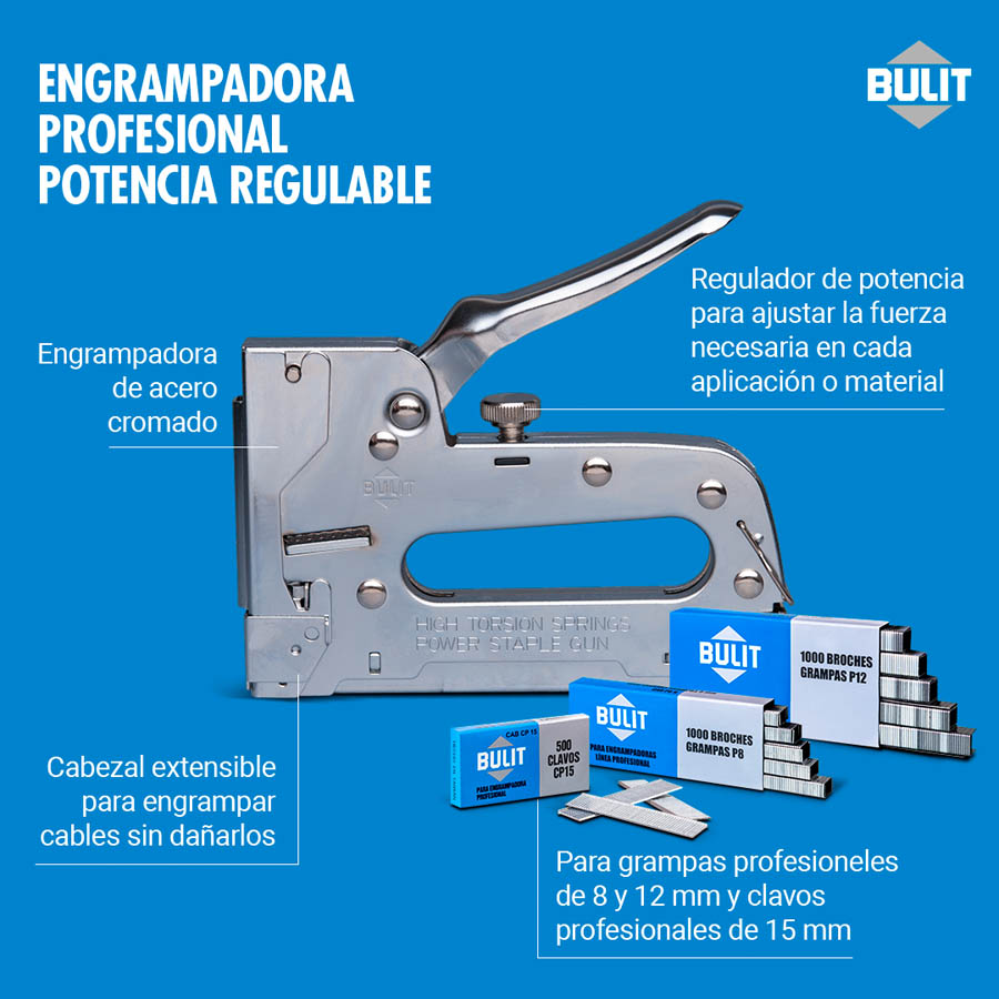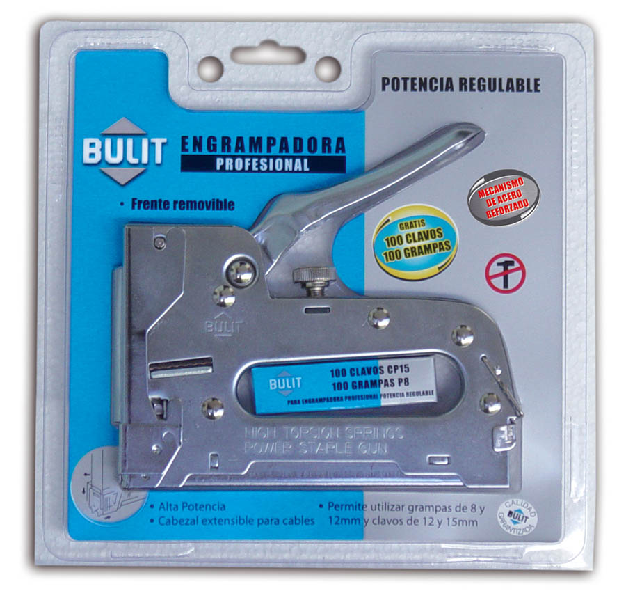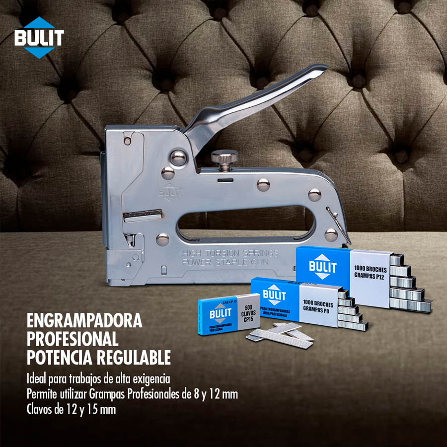 Permite utilizar: grampas BULIT Profesionales de 8 y 12 mm y Clavos BULIT Profesionales de 15 mm.
