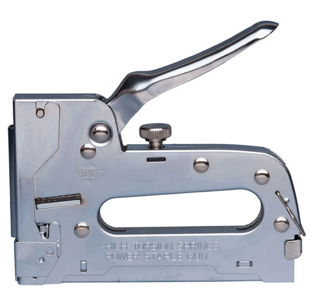 Engrampadora profesional de acero cromado con regulador de potencia que permite ajustar la fuerza requerida para cada aplicación y material en particular.