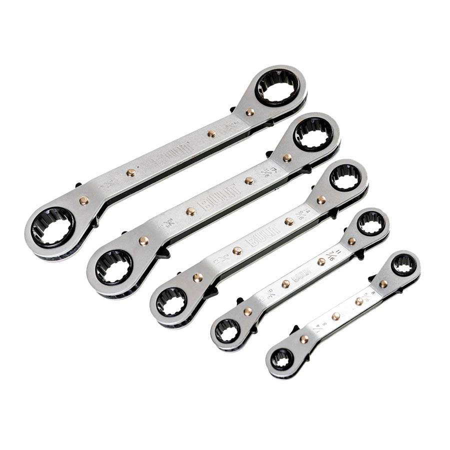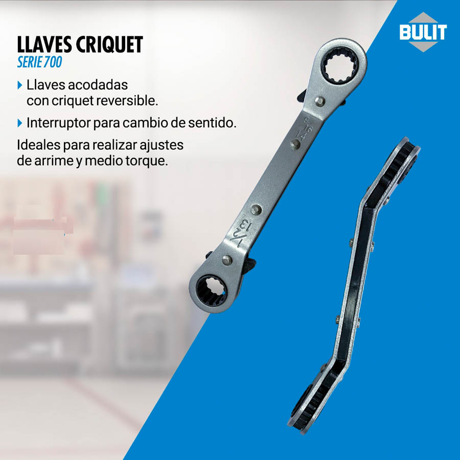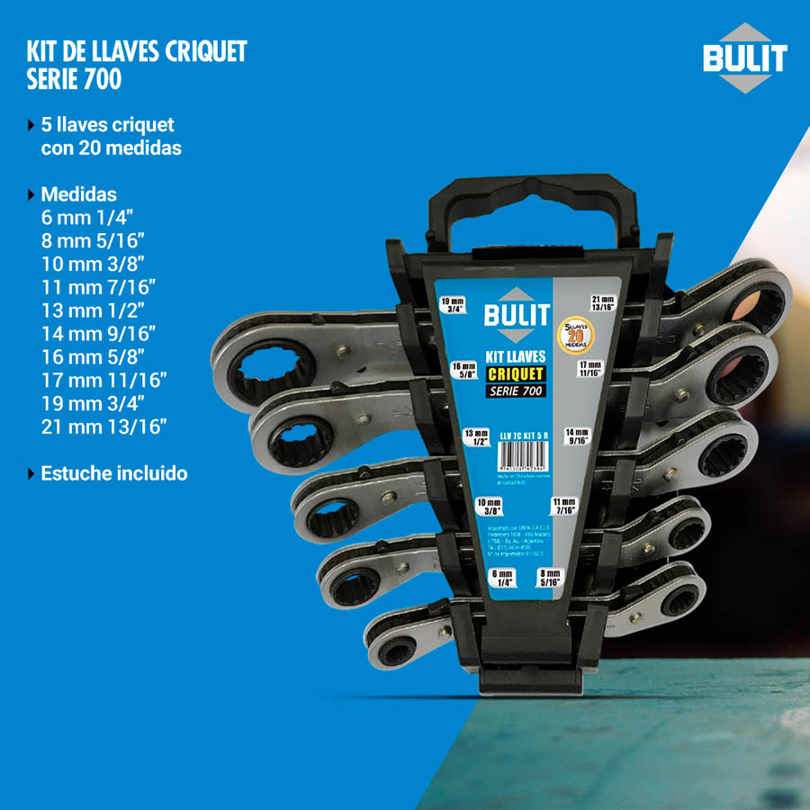 Contiene 5 llaves acodadas con criquet reversible e interruptor para cambio de sentido. 4 medidas por llave. Total 20 medidas.